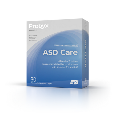 Probyx ASD Care™ was developed within this evolving scientific landscape as an outcome-led microbiome formulation designed to support gastrointestinal comfort and microbiome balance in children with neurodevelopmental vulnerability. The product is not positioned as a treatment for neurodevelopmental conditions, nor as a modifier of core diagnostic features. Instead, ASD Care reflects a supportive strategy aimed at addressing gastrointestinal and microbiome-related factors that may influence overall well-being and quality of life in this population. The formulation is based on a multi-strain probiotic complex developed by Probiotical, selected on the basis of human clinical research conducted specifically in children with neurodevelopmental profiles.